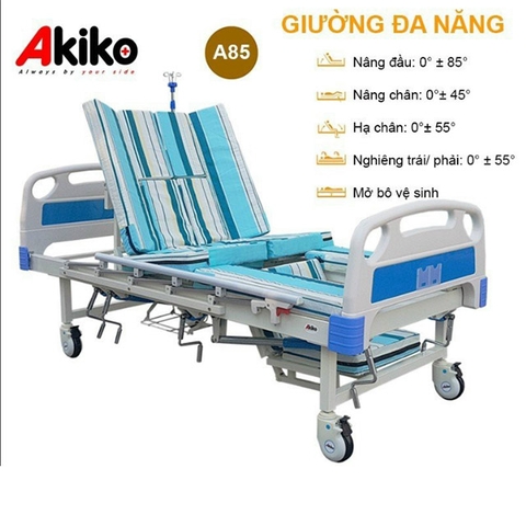 Giường bệnh nhân đa chức năng AKIKO A85 mẫu giường đa chức năng 4 hoặc 5 tay quay sử dụng hỗ trợ các bệnh nhân để nằm và phục hồi chức năng trong các bệnh viện hay điều trị tại nhà. Đặc biệt với 13 chi tiết chức năng tiện lợi phù hợp cho những người phải nằm liệt giường, không thể cử động.