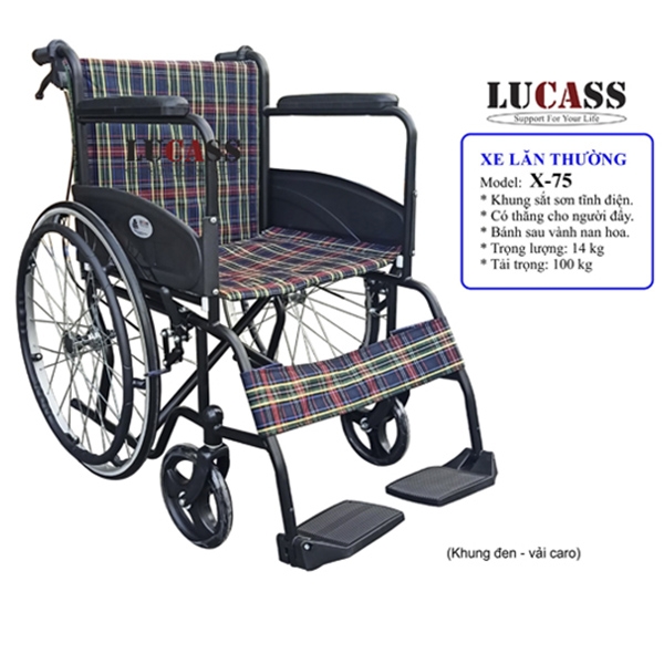 Xe lăn tay Lucass X-75 là dòng xe lăn rất phổ biến cho công việc di chuyển người già người bệnh ở trong nhà, khu phố hoặc có thể thuận tiện xếp gọn để mang theo bệnh nhân đi khám bệnh tại các bệnh viện bên ngoài. Xe lăn cho người già x-75 có thiết kế gọn gàng khả ngăng gấp gọn nhanh chóng tiện lợi bỏ cốp xe di chuyển.